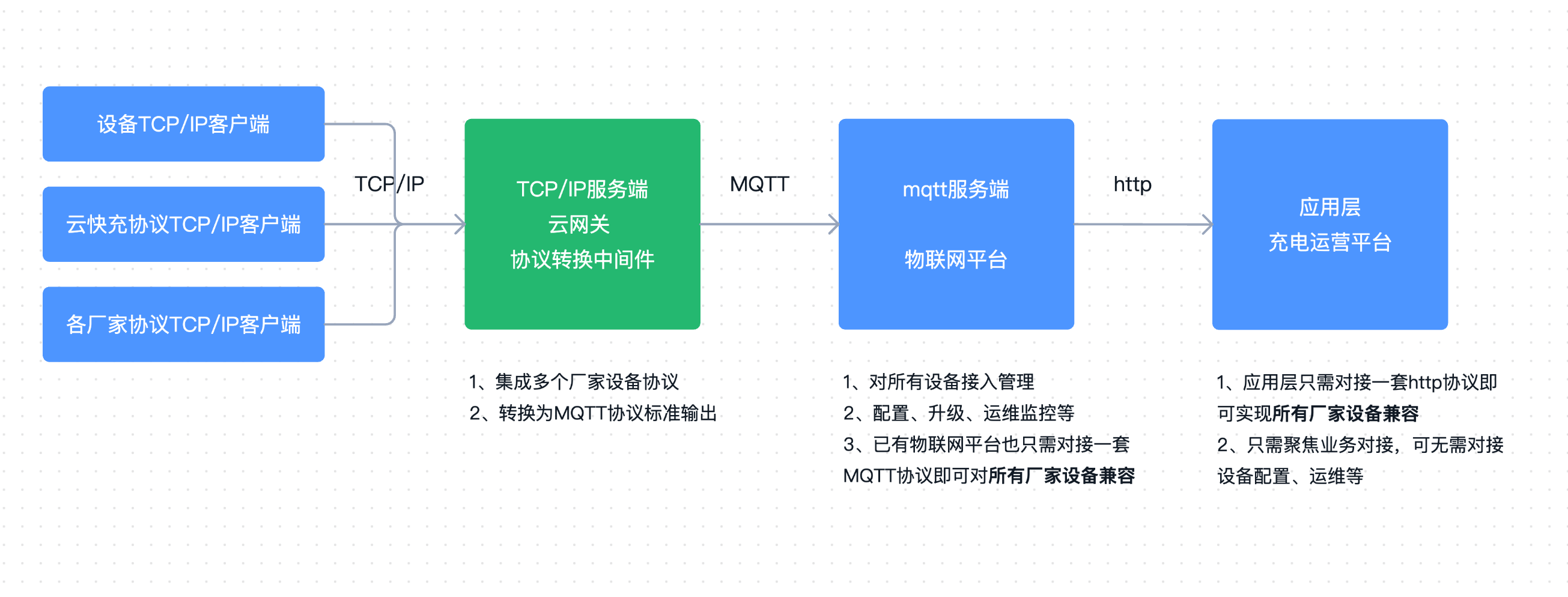 充电桩普遍用的tcp/ip协议,我们通过集成打通多种tcp/ip长连接服务中间件,转成http协议,以供业务系统直接对接,提高充电桩设备对接效率